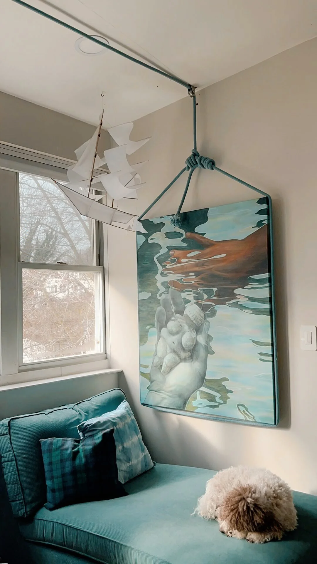 Drawing upon my ocean-based upbringing and background in art conservation, the studio becomes part-wistful shrine, part-research and development lab as I continuously adapt and augment my works for these future worlds, building their resiliency and, by extension, my own. I approach painting first in a Frankenthaler-esque method, flooding canvas with paint. This loose, pre-dying process is somewhat cosmic, setting a vast backdrop with enough depth to hold the highly detailed objects in the foreground. This creation process is reflective of my research methodology, focusing first on broad archetypal narratives, before honing in on specific works of art and moments in time.